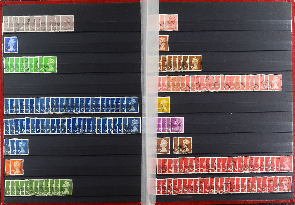 Massive holding of used 20th century, decimal-era Machins by the thousand, with more than a primary organization into 4 stockbooks (a couple a bit sparse), 5 binders (on manila stockpages) and even a few loose pages (in case there weren’t enough already!!!). Denominations from 1/2p to £5, often several dozen of a type (and there is likely duplication between the various volumes). Some nice cancels, some multiples, a number of se-tenant blocks from booklet panes. The numbers are mostly old Scott, with lots of notes about printing, tagging, etc, with a number sorted by denomination and then marked "unsorted"). A modern gold mine for the specialist. There must be near 20,000 stamps here, tucked into a single banker’s box! Estimate =