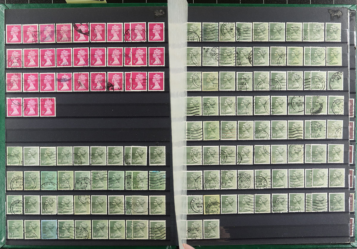 Massive holding of used 20th century, decimal-era Machins by the thousand, with more than a primary organization into 4 stockbooks (a couple a bit sparse), 5 binders (on manila stockpages) and even a few loose pages (in case there weren’t enough already!!!). Denominations from 1/2p to £5, often several dozen of a type (and there is likely duplication between the various volumes). Some nice cancels, some multiples, a number of se-tenant blocks from booklet panes. The numbers are mostly old Scott, with lots of notes about printing, tagging, etc, with a number sorted by denomination and then marked "unsorted"). A modern gold mine for the specialist. There must be near 20,000 stamps here, tucked into a single banker’s box! Estimate =