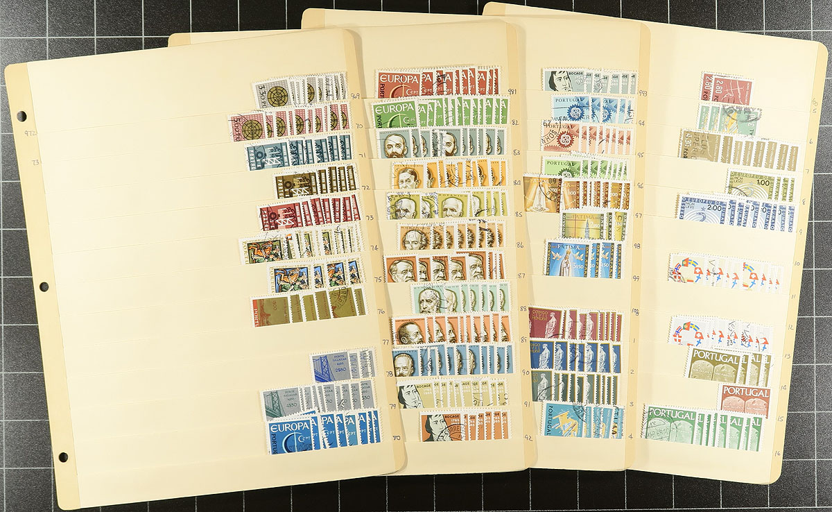 Balance of a mostly used holding of Portugal. Starting with a large binder, filled with manila stockpages neatly organized regular issues into the 1970's, often up to a dozen copies at a time, with a number of readable cancels. Next is a 16 and 32-page stockbook with emerald-green covers, laid out more like a collection (with little duplication), including more recent 1990's issues and a bit from the "back of the book" and even a touch from the Azores. A collector’s duplicates, first time on the market. Estimate =