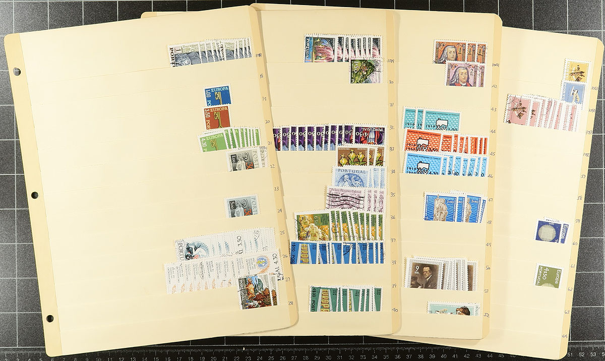Balance of a mostly used holding of Portugal. Starting with a large binder, filled with manila stockpages neatly organized regular issues into the 1970's, often up to a dozen copies at a time, with a number of readable cancels. Next is a 16 and 32-page stockbook with emerald-green covers, laid out more like a collection (with little duplication), including more recent 1990's issues and a bit from the "back of the book" and even a touch from the Azores. A collector’s duplicates, first time on the market. Estimate =