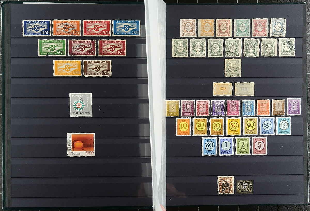 Balance of a mostly used holding of Portugal. Starting with a large binder, filled with manila stockpages neatly organized regular issues into the 1970's, often up to a dozen copies at a time, with a number of readable cancels. Next is a 16 and 32-page stockbook with emerald-green covers, laid out more like a collection (with little duplication), including more recent 1990's issues and a bit from the "back of the book" and even a touch from the Azores. A collector’s duplicates, first time on the market. Estimate =