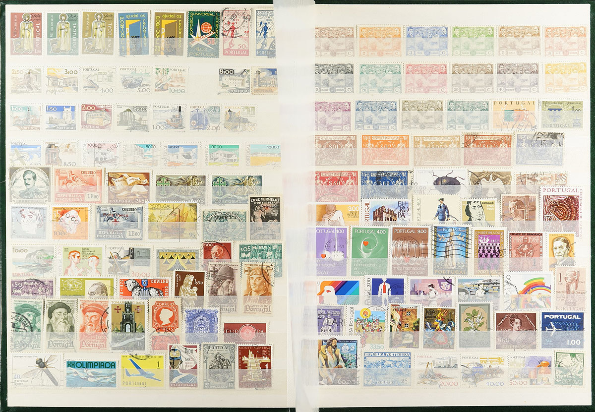 Balance of a mostly used holding of Portugal. Starting with a large binder, filled with manila stockpages neatly organized regular issues into the 1970's, often up to a dozen copies at a time, with a number of readable cancels. Next is a 16 and 32-page stockbook with emerald-green covers, laid out more like a collection (with little duplication), including more recent 1990's issues and a bit from the "back of the book" and even a touch from the Azores. A collector’s duplicates, first time on the market. Estimate =