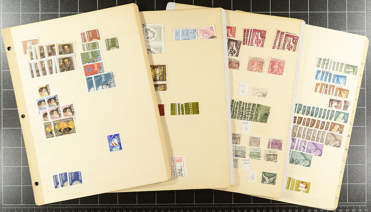 Balance of a mostly used holding of Portugal. Starting with a large binder, filled with manila stockpages neatly organized regular issues into the 1970's, often up to a dozen copies at a time, with a number of readable cancels. Next is a 16 and 32-page stockbook with emerald-green covers, laid out more like a collection (with little duplication), including more recent 1990's issues and a bit from the "back of the book" and even a touch from the Azores. A collector’s duplicates, first time on the market. Estimate =
