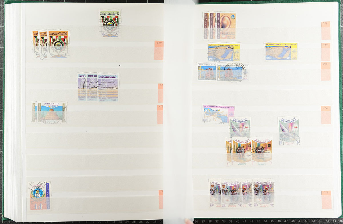 We are pretty sure that you have never seen a used wholesale stock like this before. A "modern" country that didn’t start issuing stamps until 1972, this stock is an extensive offering that is very complete up to about 1990 (often up to 20 of a type) and then spotty to 2010, including a few souvenir sheets and multiples. Starts with a scattering of "UAE" overprints on "Abu Dhabi" issues including #9 and #10. Lots of high values everywhere with individual catalogue values to $50.00, such as #157 (20 copies x $20.00 each), #311-313 (over a dozen groups at $78.00 each). Small print quantities. Middle eastern material is finding a new audience these days. All neatly arranged in 2x 64-page Lighthouse stockbooks. Few faults expected. Estimate =