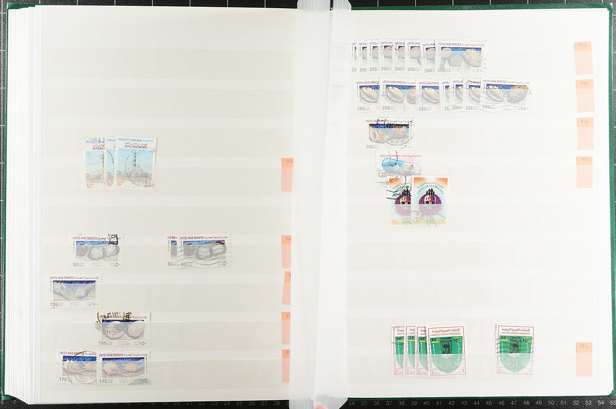 We are pretty sure that you have never seen a used wholesale stock like this before. A "modern" country that didn’t start issuing stamps until 1972, this stock is an extensive offering that is very complete up to about 1990 (often up to 20 of a type) and then spotty to 2010, including a few souvenir sheets and multiples. Starts with a scattering of "UAE" overprints on "Abu Dhabi" issues including #9 and #10. Lots of high values everywhere with individual catalogue values to $50.00, such as #157 (20 copies x $20.00 each), #311-313 (over a dozen groups at $78.00 each). Small print quantities. Middle eastern material is finding a new audience these days. All neatly arranged in 2x 64-page Lighthouse stockbooks. Few faults expected. Estimate =