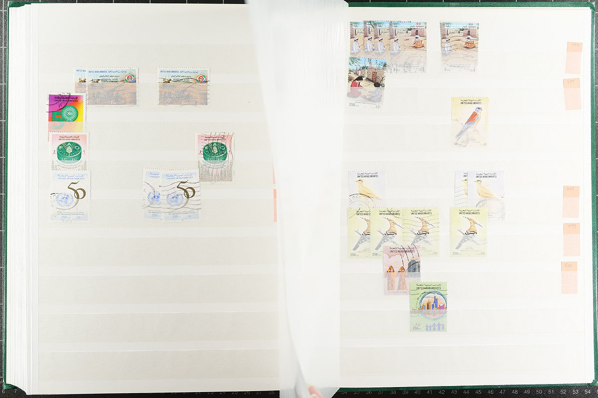 We are pretty sure that you have never seen a used wholesale stock like this before. A "modern" country that didn’t start issuing stamps until 1972, this stock is an extensive offering that is very complete up to about 1990 (often up to 20 of a type) and then spotty to 2010, including a few souvenir sheets and multiples. Starts with a scattering of "UAE" overprints on "Abu Dhabi" issues including #9 and #10. Lots of high values everywhere with individual catalogue values to $50.00, such as #157 (20 copies x $20.00 each), #311-313 (over a dozen groups at $78.00 each). Small print quantities. Middle eastern material is finding a new audience these days. All neatly arranged in 2x 64-page Lighthouse stockbooks. Few faults expected. Estimate =