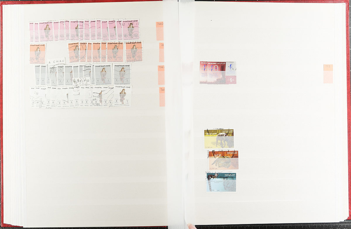 We are pretty sure that you have never seen a used wholesale stock like this before. A "modern" country that didn’t start issuing stamps until 1972, this stock is an extensive offering that is very complete up to about 1990 (often up to 20 of a type) and then spotty to 2010, including a few souvenir sheets and multiples. Starts with a scattering of "UAE" overprints on "Abu Dhabi" issues including #9 and #10. Lots of high values everywhere with individual catalogue values to $50.00, such as #157 (20 copies x $20.00 each), #311-313 (over a dozen groups at $78.00 each). Small print quantities. Middle eastern material is finding a new audience these days. All neatly arranged in 2x 64-page Lighthouse stockbooks. Few faults expected. Estimate =