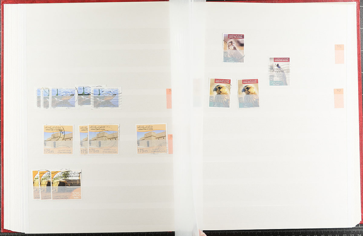 We are pretty sure that you have never seen a used wholesale stock like this before. A "modern" country that didn’t start issuing stamps until 1972, this stock is an extensive offering that is very complete up to about 1990 (often up to 20 of a type) and then spotty to 2010, including a few souvenir sheets and multiples. Starts with a scattering of "UAE" overprints on "Abu Dhabi" issues including #9 and #10. Lots of high values everywhere with individual catalogue values to $50.00, such as #157 (20 copies x $20.00 each), #311-313 (over a dozen groups at $78.00 each). Small print quantities. Middle eastern material is finding a new audience these days. All neatly arranged in 2x 64-page Lighthouse stockbooks. Few faults expected. Estimate =