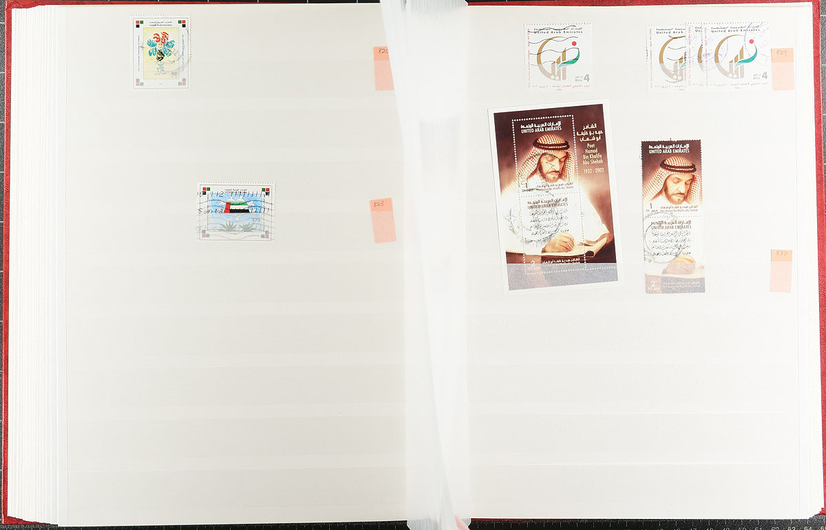 We are pretty sure that you have never seen a used wholesale stock like this before. A "modern" country that didn’t start issuing stamps until 1972, this stock is an extensive offering that is very complete up to about 1990 (often up to 20 of a type) and then spotty to 2010, including a few souvenir sheets and multiples. Starts with a scattering of "UAE" overprints on "Abu Dhabi" issues including #9 and #10. Lots of high values everywhere with individual catalogue values to $50.00, such as #157 (20 copies x $20.00 each), #311-313 (over a dozen groups at $78.00 each). Small print quantities. Middle eastern material is finding a new audience these days. All neatly arranged in 2x 64-page Lighthouse stockbooks. Few faults expected. Estimate =