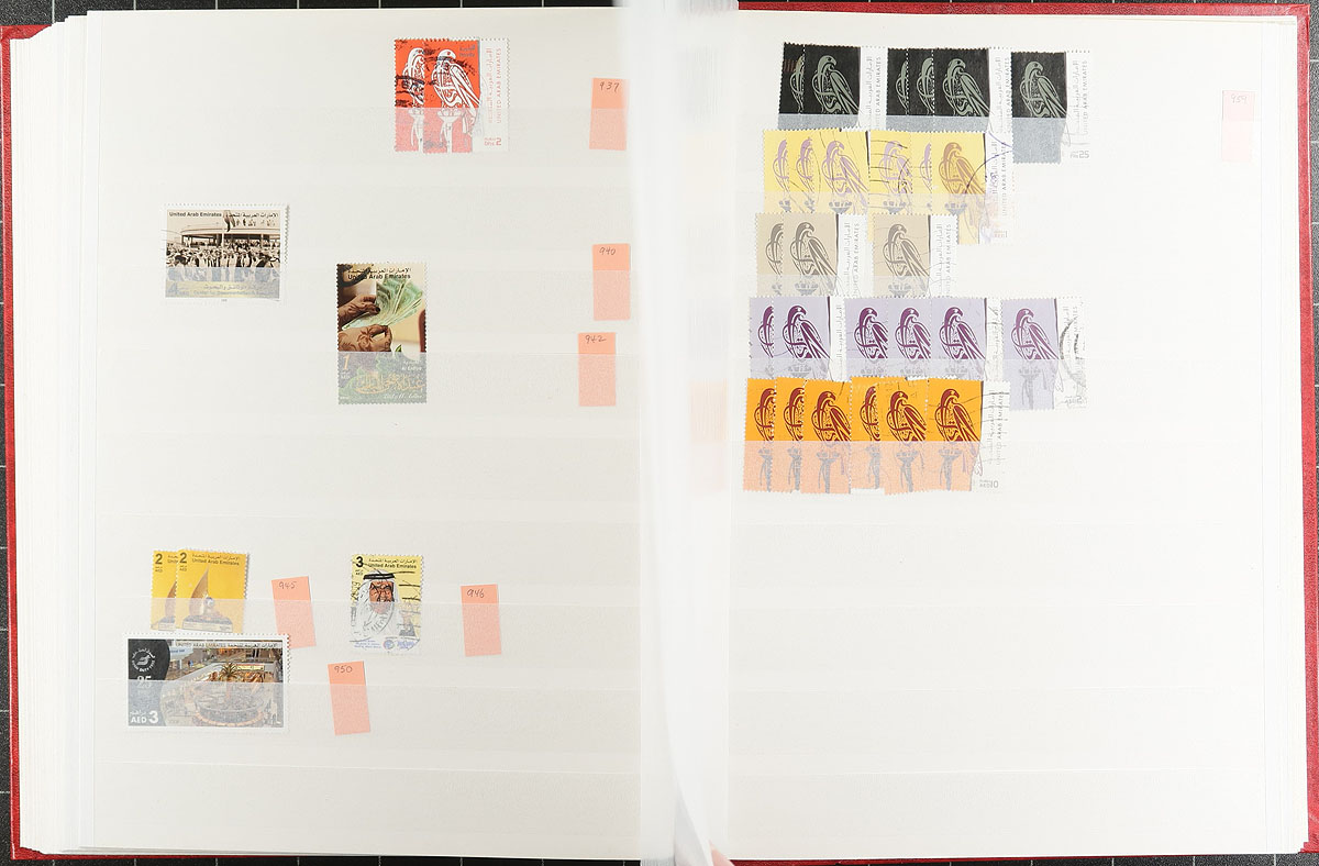 We are pretty sure that you have never seen a used wholesale stock like this before. A "modern" country that didn’t start issuing stamps until 1972, this stock is an extensive offering that is very complete up to about 1990 (often up to 20 of a type) and then spotty to 2010, including a few souvenir sheets and multiples. Starts with a scattering of "UAE" overprints on "Abu Dhabi" issues including #9 and #10. Lots of high values everywhere with individual catalogue values to $50.00, such as #157 (20 copies x $20.00 each), #311-313 (over a dozen groups at $78.00 each). Small print quantities. Middle eastern material is finding a new audience these days. All neatly arranged in 2x 64-page Lighthouse stockbooks. Few faults expected. Estimate =