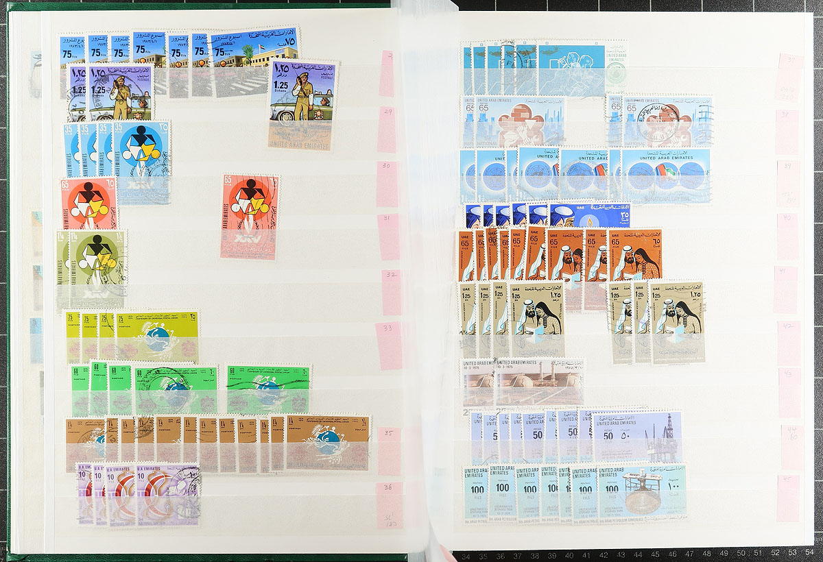We are pretty sure that you have never seen a used wholesale stock like this before. A "modern" country that didn’t start issuing stamps until 1972, this stock is an extensive offering that is very complete up to about 1990 (often up to 20 of a type) and then spotty to 2010, including a few souvenir sheets and multiples. Starts with a scattering of "UAE" overprints on "Abu Dhabi" issues including #9 and #10. Lots of high values everywhere with individual catalogue values to $50.00, such as #157 (20 copies x $20.00 each), #311-313 (over a dozen groups at $78.00 each). Small print quantities. Middle eastern material is finding a new audience these days. All neatly arranged in 2x 64-page Lighthouse stockbooks. Few faults expected. Estimate =
