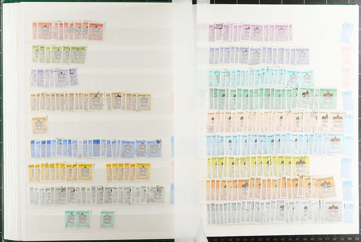 We are pretty sure that you have never seen a used wholesale stock like this before. A "modern" country that didn’t start issuing stamps until 1972, this stock is an extensive offering that is very complete up to about 1990 (often up to 20 of a type) and then spotty to 2010, including a few souvenir sheets and multiples. Starts with a scattering of "UAE" overprints on "Abu Dhabi" issues including #9 and #10. Lots of high values everywhere with individual catalogue values to $50.00, such as #157 (20 copies x $20.00 each), #311-313 (over a dozen groups at $78.00 each). Small print quantities. Middle eastern material is finding a new audience these days. All neatly arranged in 2x 64-page Lighthouse stockbooks. Few faults expected. Estimate =