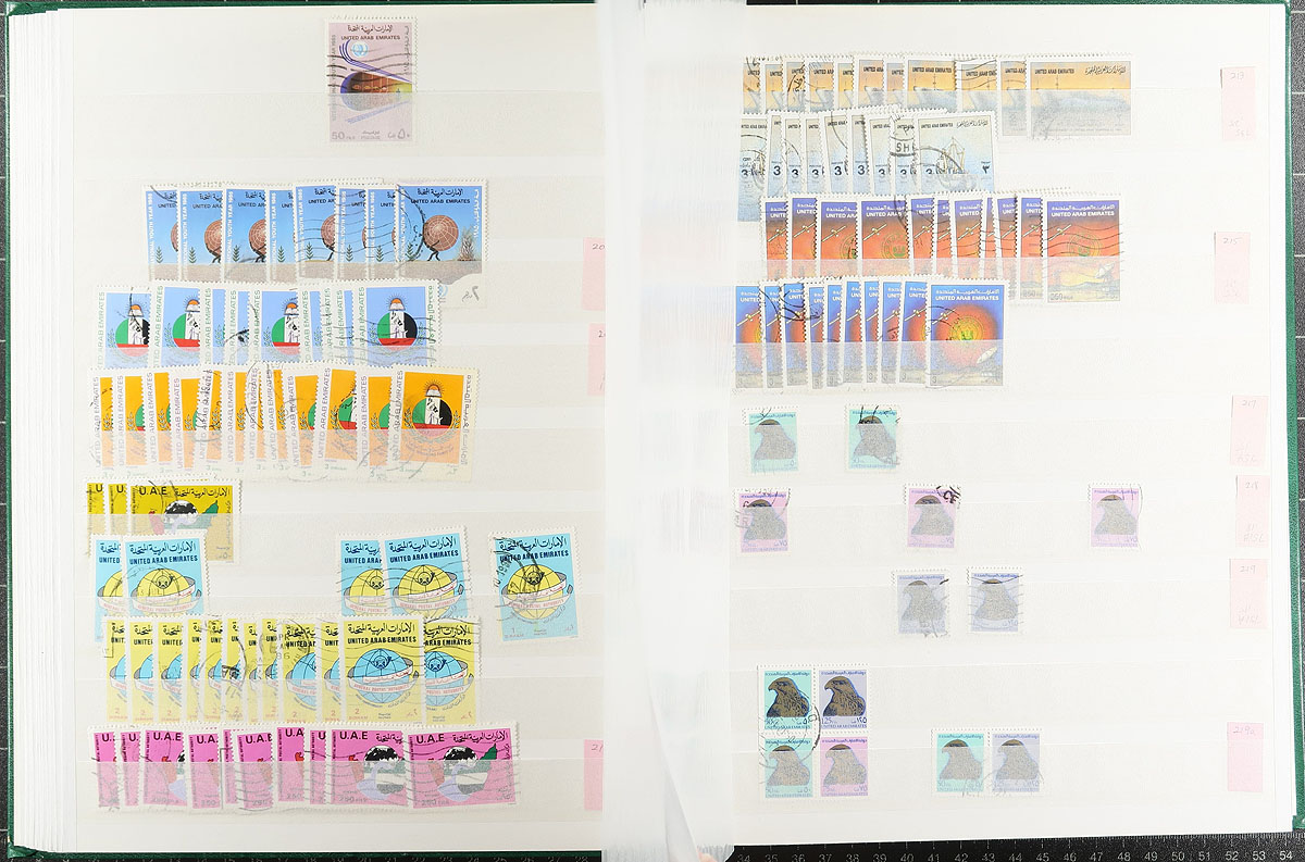 We are pretty sure that you have never seen a used wholesale stock like this before. A "modern" country that didn’t start issuing stamps until 1972, this stock is an extensive offering that is very complete up to about 1990 (often up to 20 of a type) and then spotty to 2010, including a few souvenir sheets and multiples. Starts with a scattering of "UAE" overprints on "Abu Dhabi" issues including #9 and #10. Lots of high values everywhere with individual catalogue values to $50.00, such as #157 (20 copies x $20.00 each), #311-313 (over a dozen groups at $78.00 each). Small print quantities. Middle eastern material is finding a new audience these days. All neatly arranged in 2x 64-page Lighthouse stockbooks. Few faults expected. Estimate =