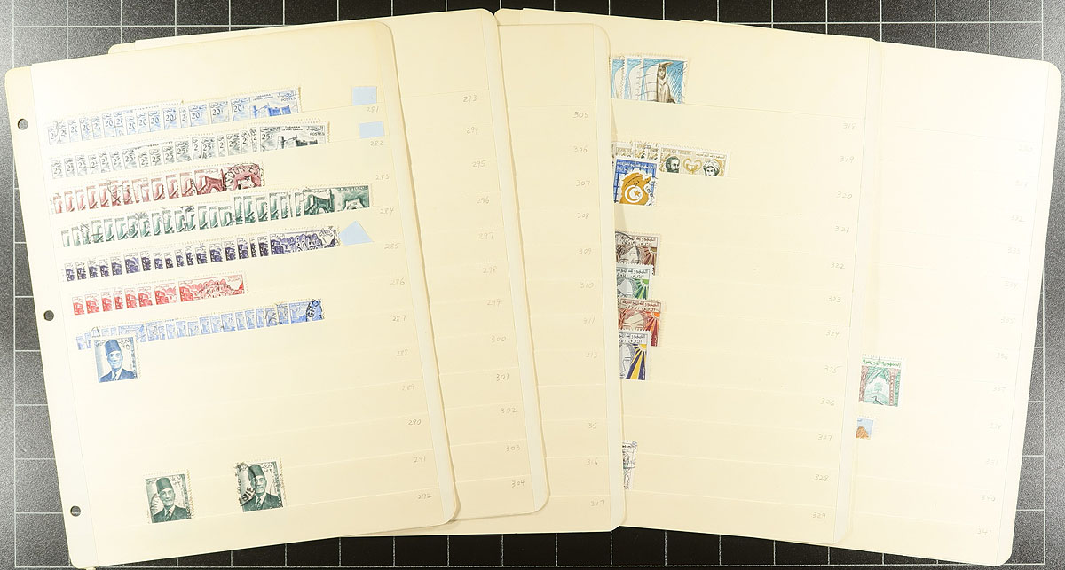 Substantial wholesale used accumulation, covering a century (1888-1990) and neatly organized on 100 manila stockpages (in two large binders), with a good range of material to the mid-1970's, the balance and the back of the book is a bit scattered. There are up to a dozen of a type, with values to $15.00 per stamps (e.g. #4, #363B). The only 4 postal history items in the lot are a set of airmail stamps on 1932 Regional Exhibition postcards, with the stamps tied to the view side (these sets typically retail at over $100.00). An unusual North Africa holding, which is NOT a dealer stock, but a collector’s holding. Estimate =