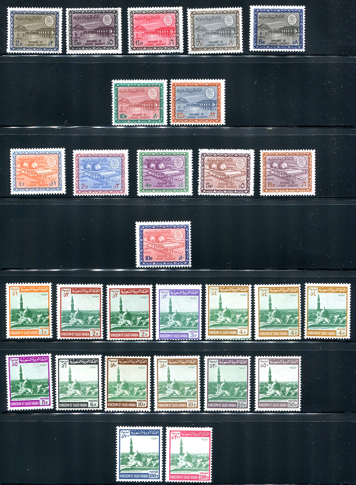 In the late 1960’s Saudi Arabia kept making changes to the designs of its "Dam", "Oil Plant" and "Mosque" definitives, leaving some very small, short-lived printings that went under appreciated for years. This mint selection has several values from the 1968 "Dam" issue with the Faisal Cartouche" with #462, #465-468, #470, #472 (this one with gum disturbance) plus a few from the "Oil Plant" (#476) and most of the "Mosque" set, including four which are redrawn/reprinted. A lovely offering. 2024 Scott US$944.40 =