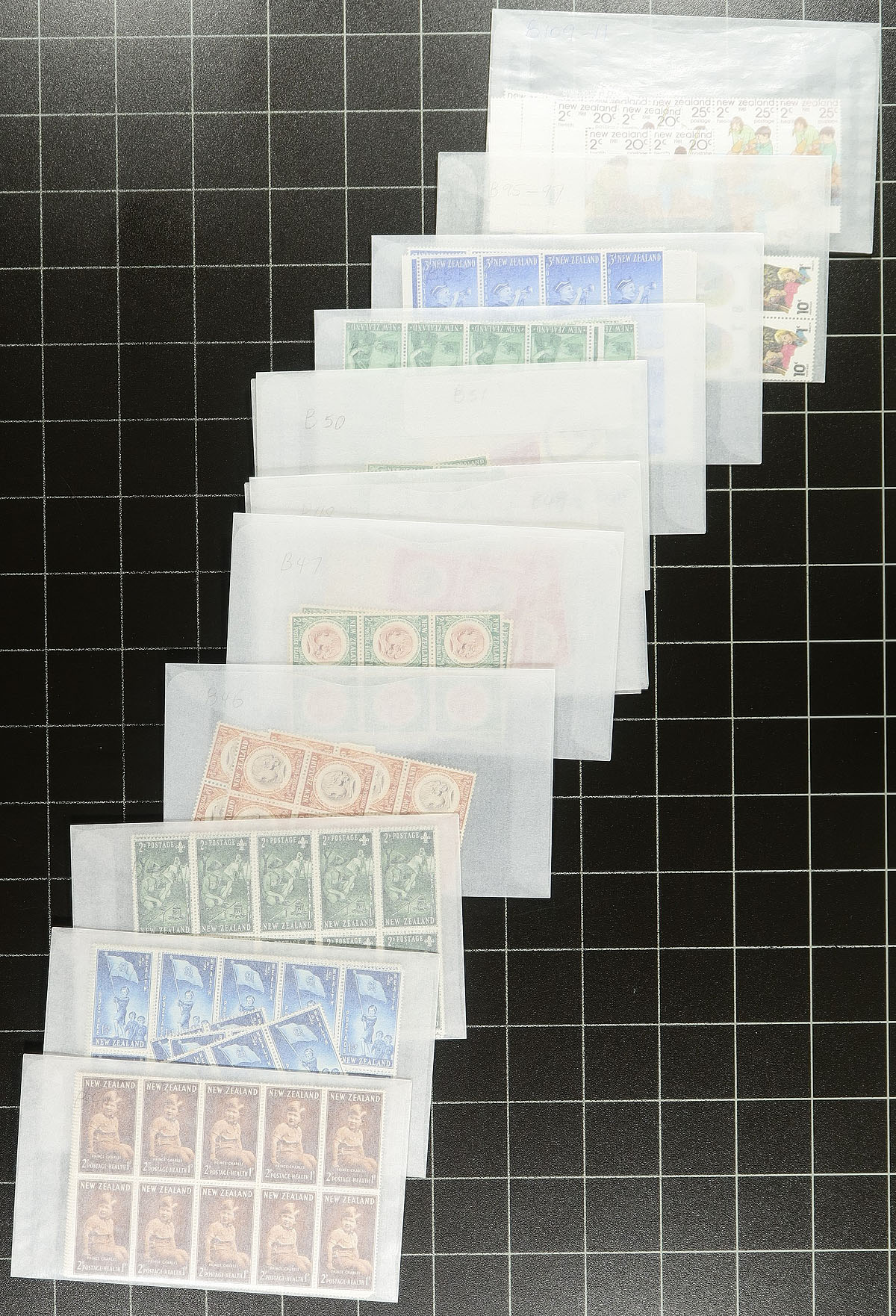 Small, mint wholesale lot of 20th century issues, including a bit of semi-postals. Most are blocks of six up to partial panes, all neatly folded into glassine envelopes with their Scott number in pencil. Most are QEII-era, with significant strength in the 1990’s including the bird definitives and a few commemorative issues with face value to $1.50. The total face value of the modern material (alone) is around NZ$250.00. Estimate =