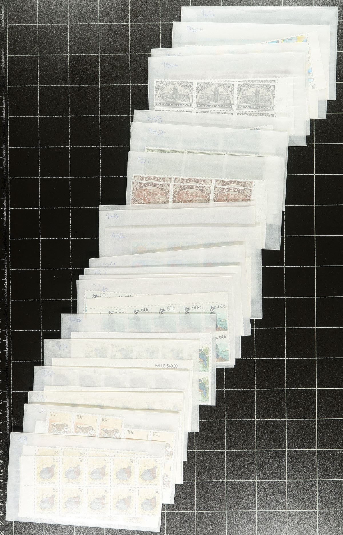 Small, mint wholesale lot of 20th century issues, including a bit of semi-postals. Most are blocks of six up to partial panes, all neatly folded into glassine envelopes with their Scott number in pencil. Most are QEII-era, with significant strength in the 1990’s including the bird definitives and a few commemorative issues with face value to $1.50. The total face value of the modern material (alone) is around NZ$250.00. Estimate =