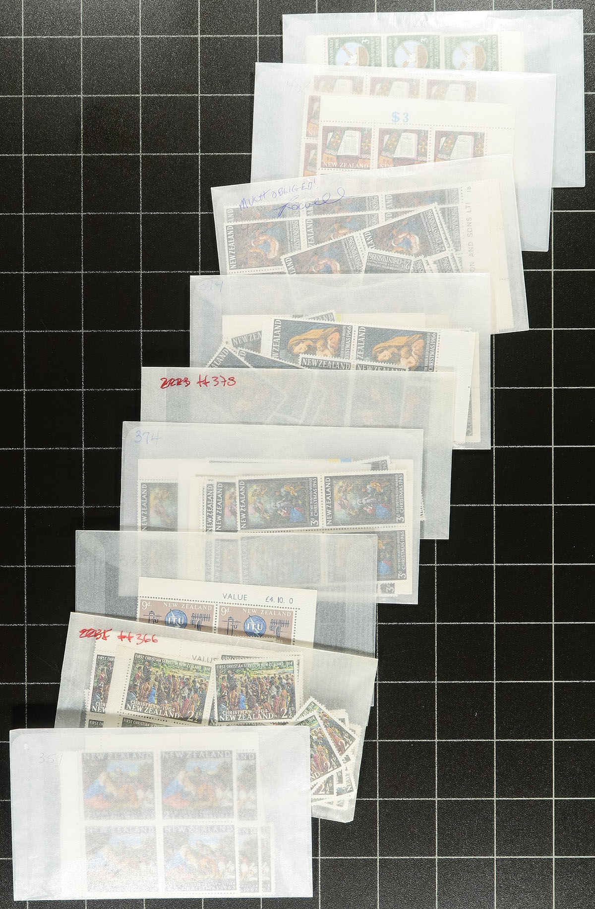 Small, mint wholesale lot of 20th century issues, including a bit of semi-postals. Most are blocks of six up to partial panes, all neatly folded into glassine envelopes with their Scott number in pencil. Most are QEII-era, with significant strength in the 1990’s including the bird definitives and a few commemorative issues with face value to $1.50. The total face value of the modern material (alone) is around NZ$250.00. Estimate =