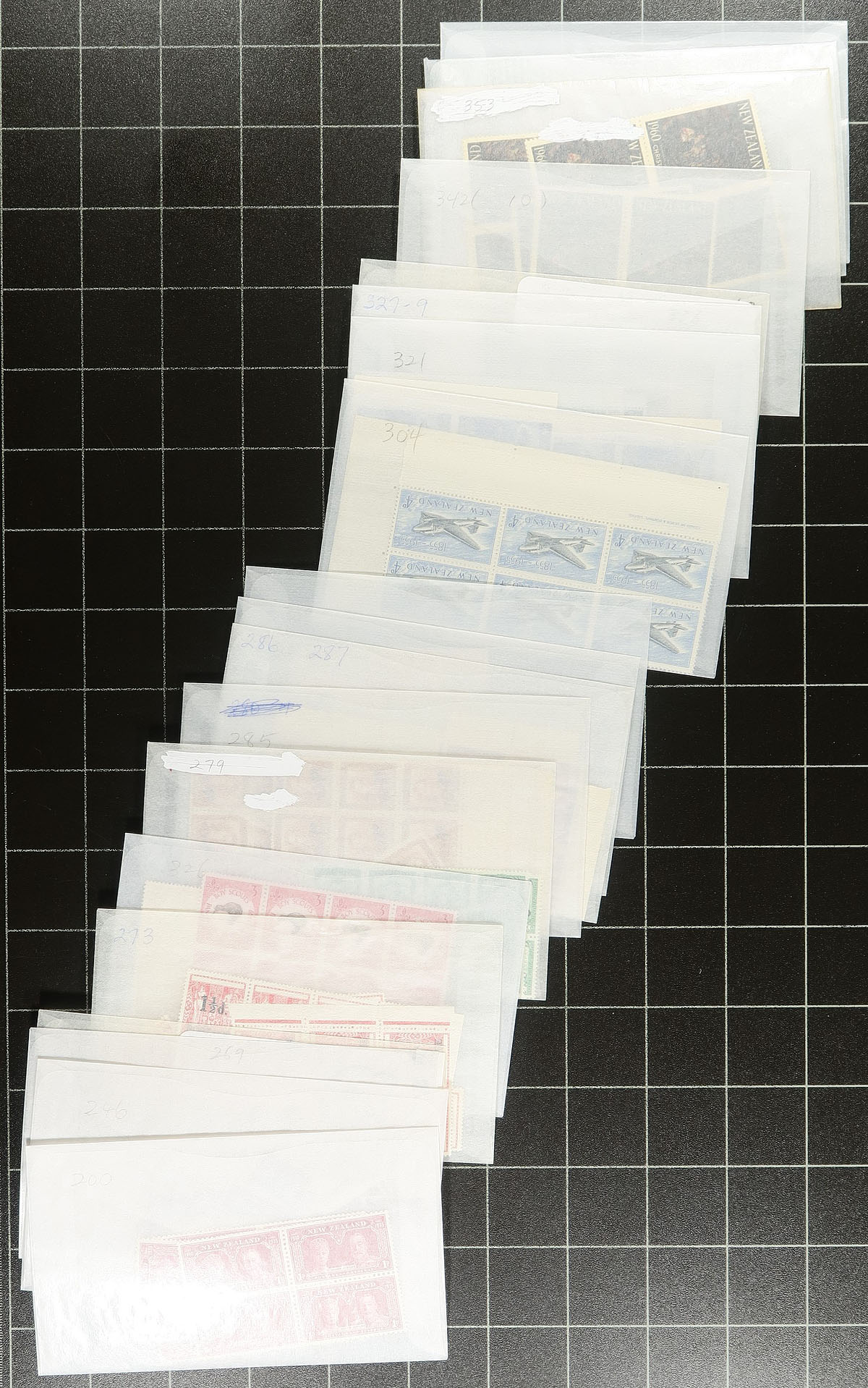 Small, mint wholesale lot of 20th century issues, including a bit of semi-postals. Most are blocks of six up to partial panes, all neatly folded into glassine envelopes with their Scott number in pencil. Most are QEII-era, with significant strength in the 1990’s including the bird definitives and a few commemorative issues with face value to $1.50. The total face value of the modern material (alone) is around NZ$250.00. Estimate =