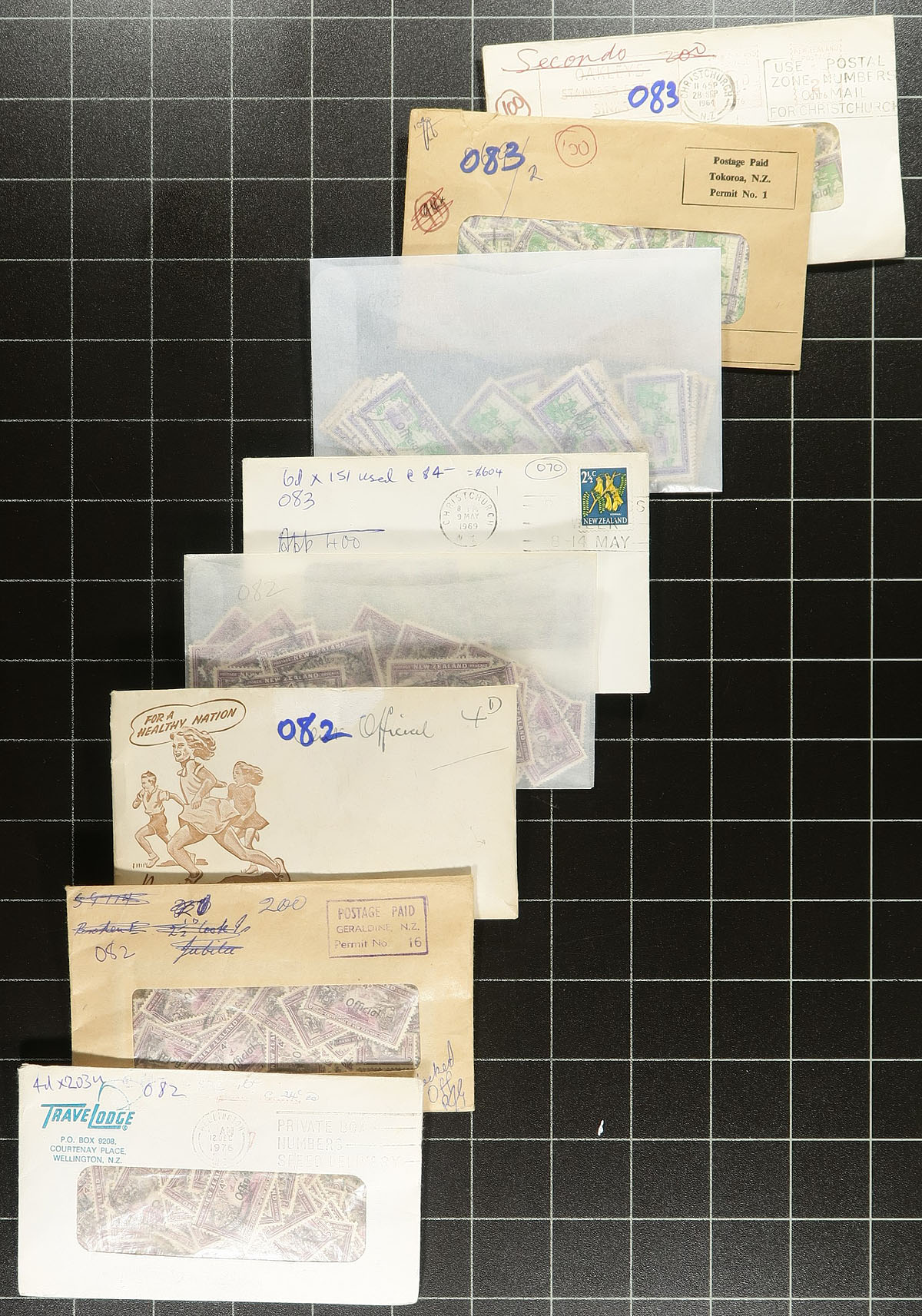 A shoebox stuffed with a wholesale lot of used "back of the book", the strongest is the official overprints, including hundreds, if not thousands of various denominations from the 1940 Centenary set (#O76/O86). These came out of New Zealand 25+ years ago and were quite popular for approval sellers or packet builders. There is a bit of semi-postal ("health"), life insurance and newspaper stamps along with a couple of "Arms" postal fiscals. Estimate =