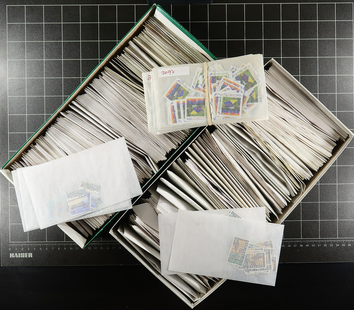 Two shoeboxes tightly packed with a well-organized stock of regular issue used Queen Elizabeth II era, up to 2008. Includes lots of better, recent material, with mid-level denominations (to $2.50). Quantities are from a few to a hundred per glassine. All identified by Scott number, perfect as a collection or stock builder. There could be some cancel interest throughout, amongst the substantial catalogue value that is here. Estimate =