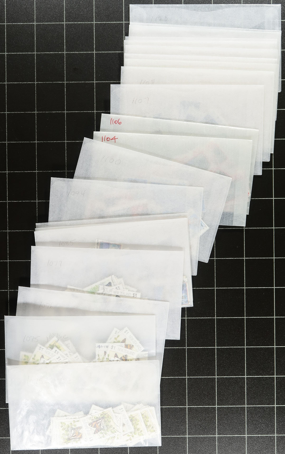 Two shoeboxes tightly packed with a well-organized stock of regular issue used Queen Elizabeth II era, up to 2008. Includes lots of better, recent material, with mid-level denominations (to $2.50). Quantities are from a few to a hundred per glassine. All identified by Scott number, perfect as a collection or stock builder. There could be some cancel interest throughout, amongst the substantial catalogue value that is here. Estimate =
