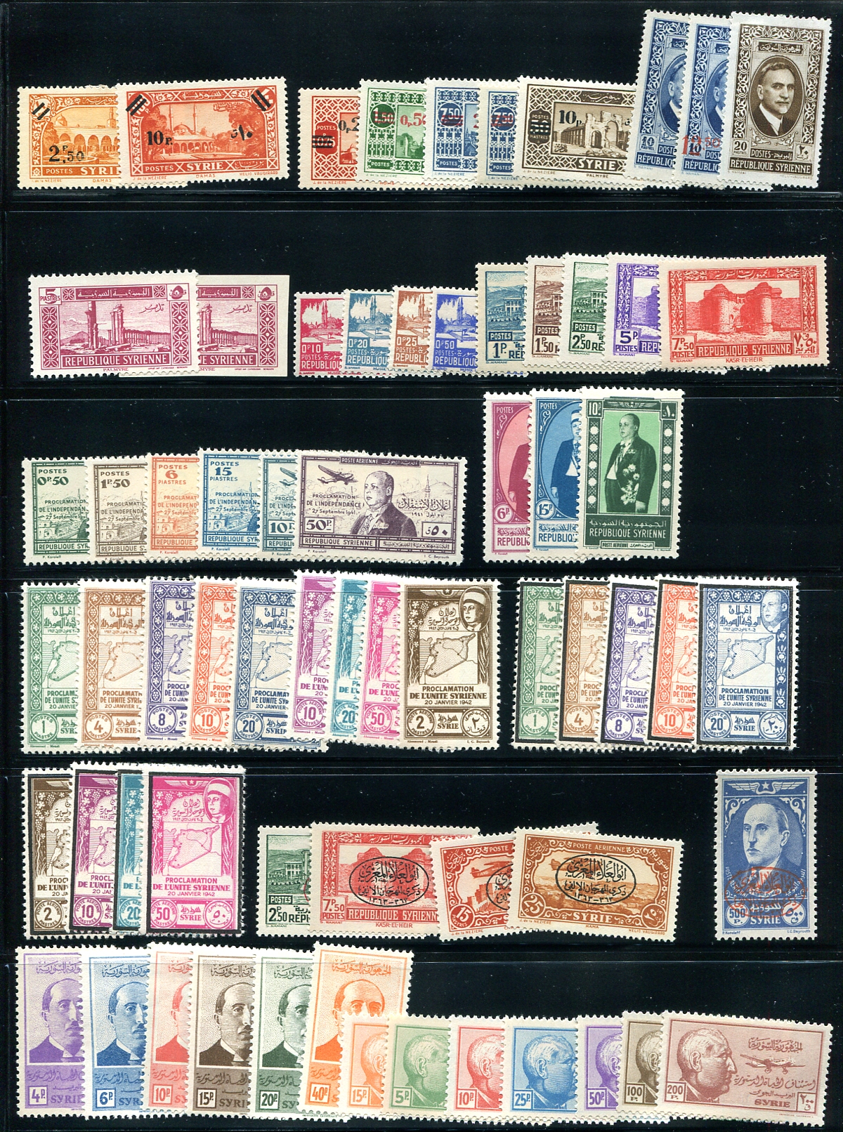 Two pages of mint sets and singles, most with the accompanying air mail issues from the mid-1920’s to the end of World War II. A very complete offering, with only the occasional item missing. All are fresh, hinged (a few are never hinged). Not often seen material from the Middle East. 2024 Scott US$402.75 =