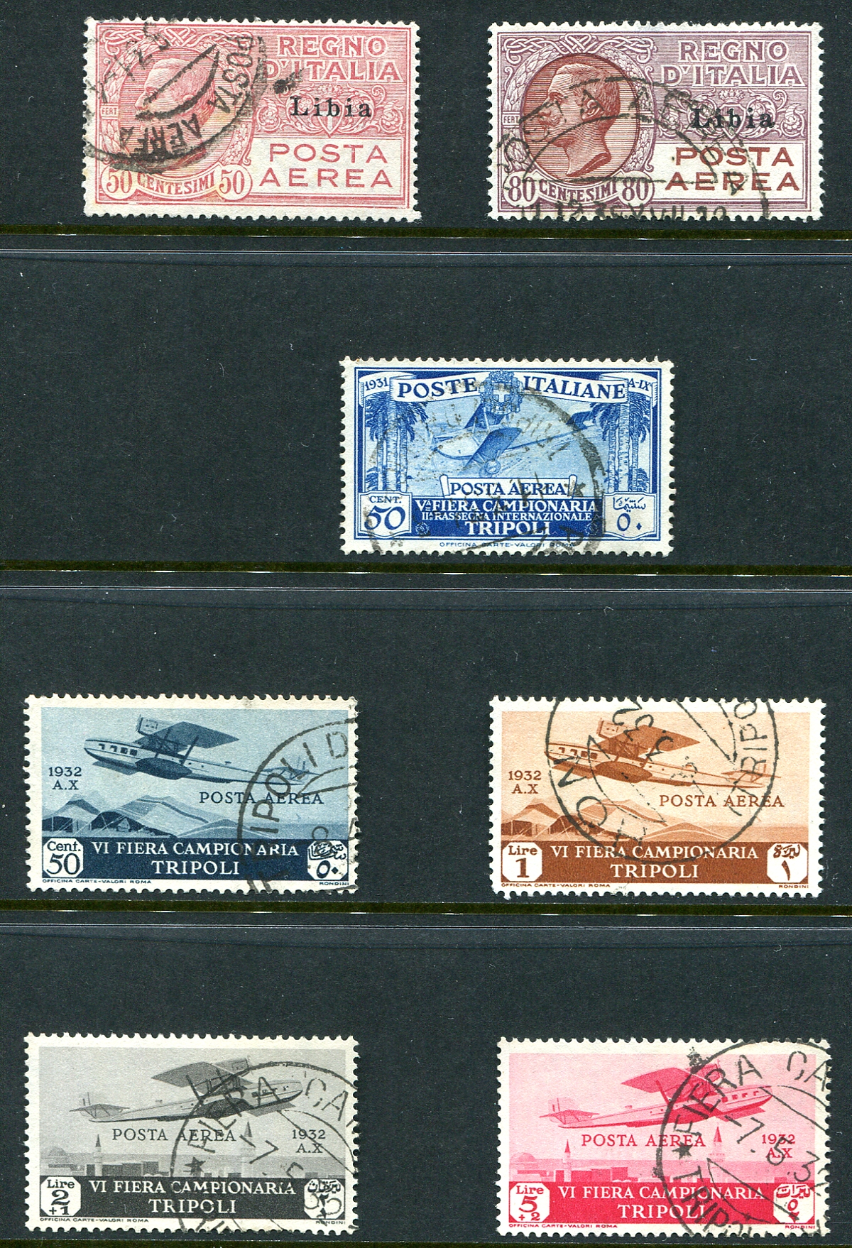 Complete first three airmail sets, all nicely cancelled. C1-C2 are 1928-29 "Libia" overprints on Italian airmail stamps. The #C3 was a colonial design issue from 1931. The four stamp 1932 "Seaplanes" (over a couple of North African landscapes) issue is a key set of Libya and Italian colonies. 2024 Scott US$614.00 =