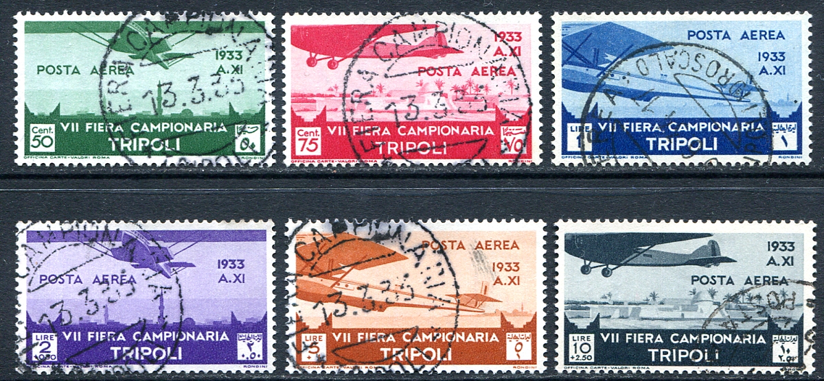 Complete set of six of the 1933 "Seaplane" design, either entering or leaving Tripoli or over Tagiura. Fresh, most with readable cancels, in excellent condition. A key airmail set. 2024 Scott US$390.00 =