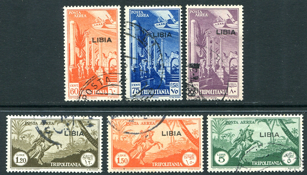 Tripolitania airmails overprinted "Libia" in 1941, a lovely used set with some attractive corner cancels. Scott only catalogues four of the six denominations, so we will let you approach this with a critical eye. 2024 Scott US$462.50 =