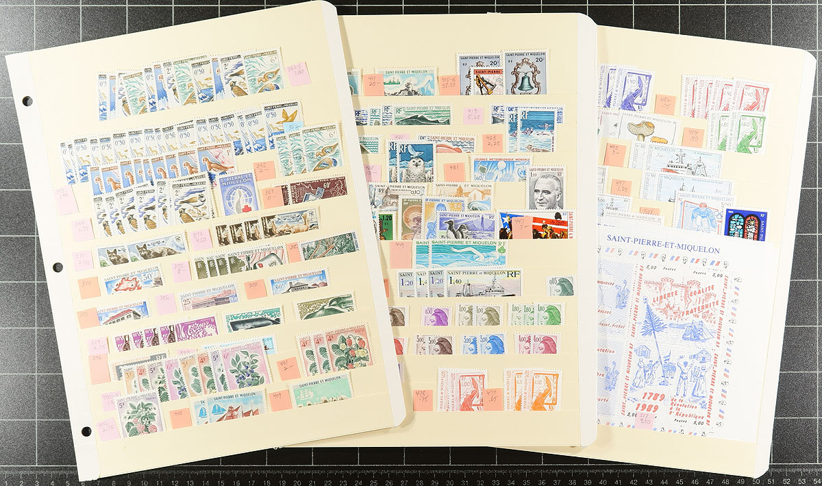 A lightly duplicated accumulation of mint SPM regular, semi-postal and air mail issues up to the early 2000's. Lots of classic "Fisherman", "Seagull", "Landscape" and "Schooner" with lots of nice post-war material, with sets and singles of up to $30.00 catalogue value. Perfect for building a collection and selling what is left to recoup your costs. Overall condition is excellent, and expect the stamps to be hinged, a few with remnants (and yes, there is some never hinged material here). All neatly identified by Scott numbers and catalogue prices on manila stockpages. Estimate =