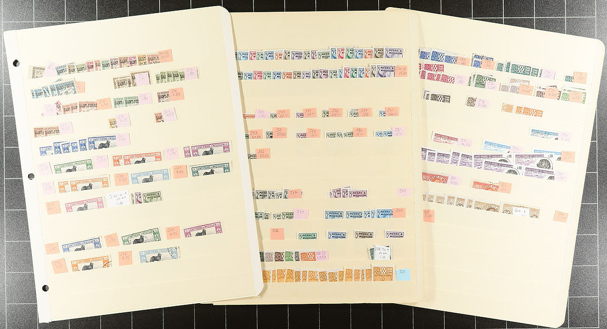 A mostly mint, three-page stock of postage due and parcel post issues from everybody’s favourite French colony in North America. Has overprints on French dues, some Labrador dog issues, four complete sets of the fish set (#J32-41) and better singles from the later sets (#J48-J53, #J58-J61, #J65-J66). Up to a dozen of a stamp, most are hinged with catalogue values that will add up quickly. This may look like a dealer’s stock, but it is one collector’s accumulation which has never been on the open market before. Estimate =