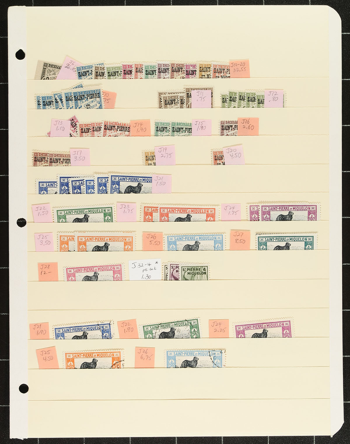 A mostly mint, three-page stock of postage due and parcel post issues from everybody’s favourite French colony in North America. Has overprints on French dues, some Labrador dog issues, four complete sets of the fish set (#J32-41) and better singles from the later sets (#J48-J53, #J58-J61, #J65-J66). Up to a dozen of a stamp, most are hinged with catalogue values that will add up quickly. This may look like a dealer’s stock, but it is one collector’s accumulation which has never been on the open market before. Estimate =