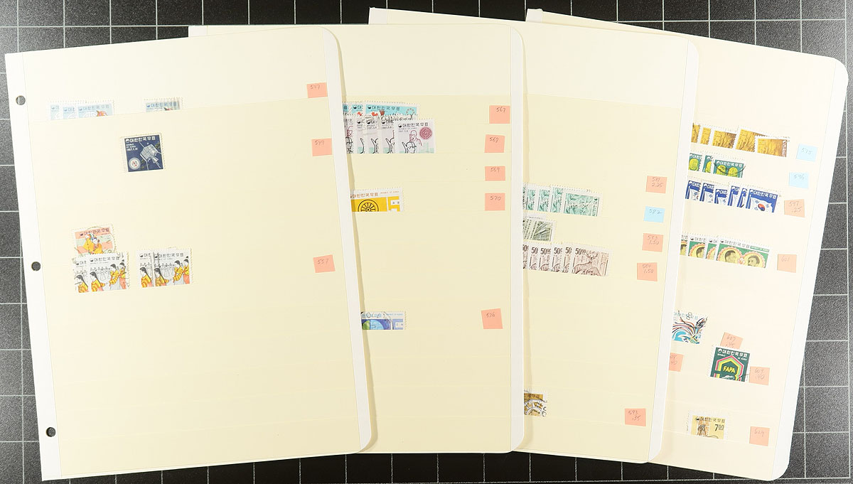 Substantial stock of used, mostly 20th century Korean issues accumulated and organized by a collector, and available for the first time. The early is a bit hit or miss (note #79 x7), and then strong post-WWII to the 1990’s, where it looks more like a collection than a stock. With a good range of semi-postals and airmails (#C30). Up to 20 of a type, catalogue values of individual items to $40.00. All are neatly organized into 50 manila stockpages identified by Scott number and (a slightly older) catalogue values. Condition is better than average and there may also be potential for the cancel collector. Substantial catalogue value here. Estimate =