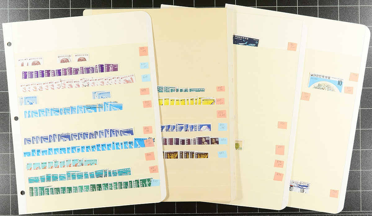 Substantial stock of used, mostly 20th century Korean issues accumulated and organized by a collector, and available for the first time. The early is a bit hit or miss (note #79 x7), and then strong post-WWII to the 1990’s, where it looks more like a collection than a stock. With a good range of semi-postals and airmails (#C30). Up to 20 of a type, catalogue values of individual items to $40.00. All are neatly organized into 50 manila stockpages identified by Scott number and (a slightly older) catalogue values. Condition is better than average and there may also be potential for the cancel collector. Substantial catalogue value here. Estimate =