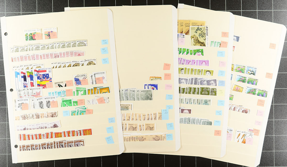 Substantial stock of used, mostly 20th century Korean issues accumulated and organized by a collector, and available for the first time. The early is a bit hit or miss (note #79 x7), and then strong post-WWII to the 1990’s, where it looks more like a collection than a stock. With a good range of semi-postals and airmails (#C30). Up to 20 of a type, catalogue values of individual items to $40.00. All are neatly organized into 50 manila stockpages identified by Scott number and (a slightly older) catalogue values. Condition is better than average and there may also be potential for the cancel collector. Substantial catalogue value here. Estimate =