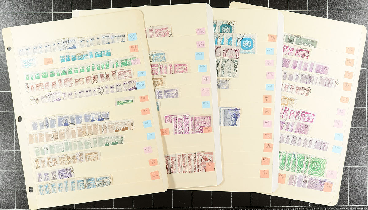 Substantial stock of used, mostly 20th century Korean issues accumulated and organized by a collector, and available for the first time. The early is a bit hit or miss (note #79 x7), and then strong post-WWII to the 1990’s, where it looks more like a collection than a stock. With a good range of semi-postals and airmails (#C30). Up to 20 of a type, catalogue values of individual items to $40.00. All are neatly organized into 50 manila stockpages identified by Scott number and (a slightly older) catalogue values. Condition is better than average and there may also be potential for the cancel collector. Substantial catalogue value here. Estimate =