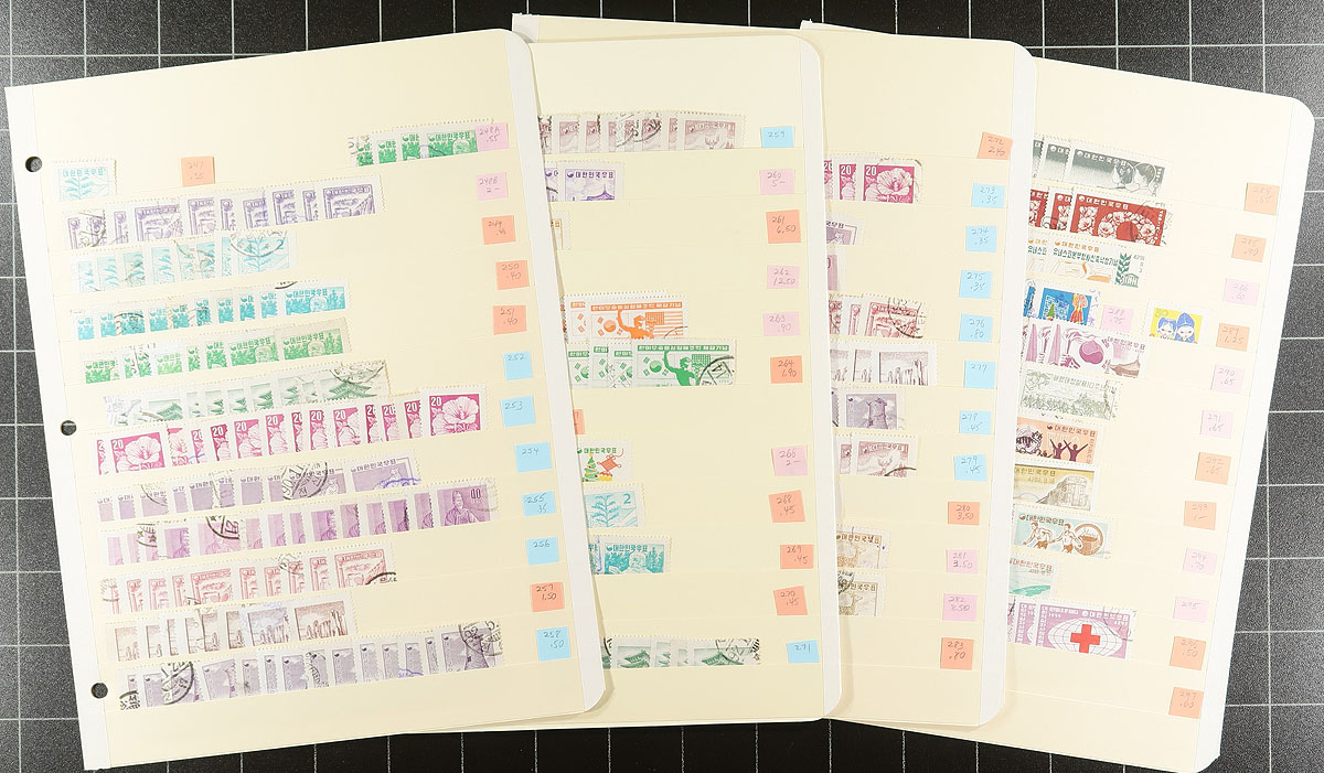 Substantial stock of used, mostly 20th century Korean issues accumulated and organized by a collector, and available for the first time. The early is a bit hit or miss (note #79 x7), and then strong post-WWII to the 1990’s, where it looks more like a collection than a stock. With a good range of semi-postals and airmails (#C30). Up to 20 of a type, catalogue values of individual items to $40.00. All are neatly organized into 50 manila stockpages identified by Scott number and (a slightly older) catalogue values. Condition is better than average and there may also be potential for the cancel collector. Substantial catalogue value here. Estimate =