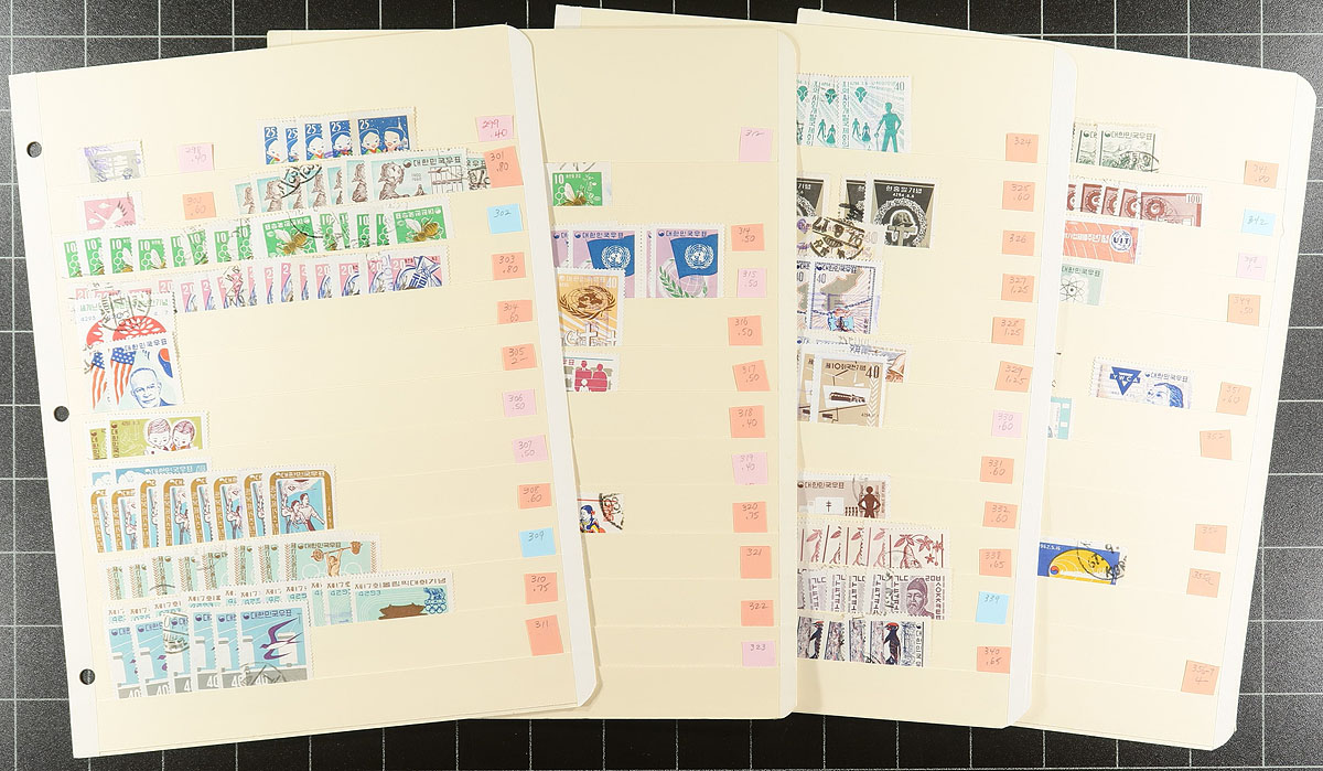 Substantial stock of used, mostly 20th century Korean issues accumulated and organized by a collector, and available for the first time. The early is a bit hit or miss (note #79 x7), and then strong post-WWII to the 1990’s, where it looks more like a collection than a stock. With a good range of semi-postals and airmails (#C30). Up to 20 of a type, catalogue values of individual items to $40.00. All are neatly organized into 50 manila stockpages identified by Scott number and (a slightly older) catalogue values. Condition is better than average and there may also be potential for the cancel collector. Substantial catalogue value here. Estimate =