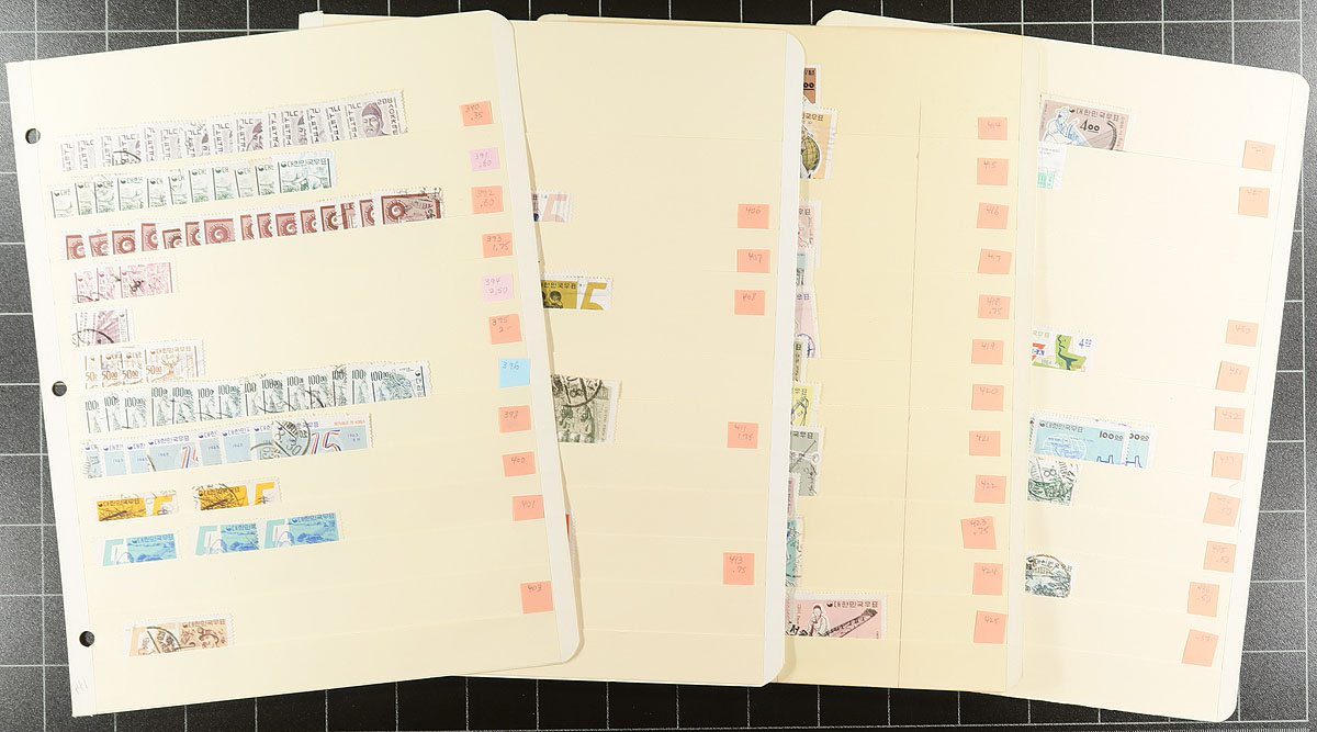 Substantial stock of used, mostly 20th century Korean issues accumulated and organized by a collector, and available for the first time. The early is a bit hit or miss (note #79 x7), and then strong post-WWII to the 1990’s, where it looks more like a collection than a stock. With a good range of semi-postals and airmails (#C30). Up to 20 of a type, catalogue values of individual items to $40.00. All are neatly organized into 50 manila stockpages identified by Scott number and (a slightly older) catalogue values. Condition is better than average and there may also be potential for the cancel collector. Substantial catalogue value here. Estimate =