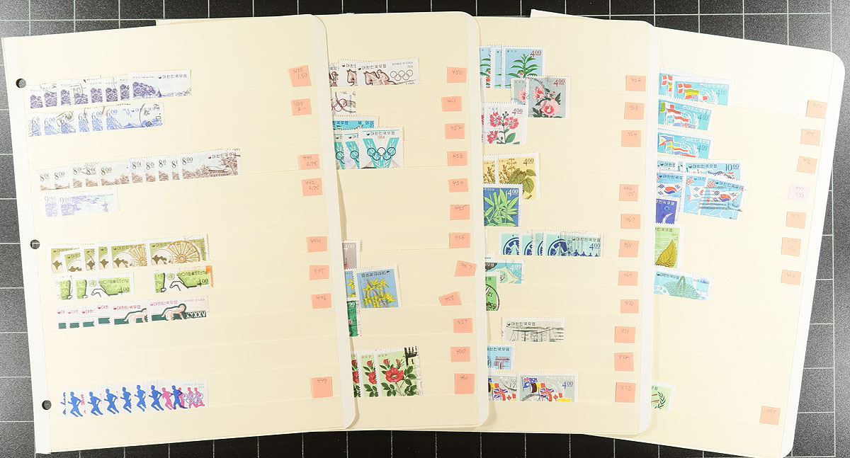 Substantial stock of used, mostly 20th century Korean issues accumulated and organized by a collector, and available for the first time. The early is a bit hit or miss (note #79 x7), and then strong post-WWII to the 1990’s, where it looks more like a collection than a stock. With a good range of semi-postals and airmails (#C30). Up to 20 of a type, catalogue values of individual items to $40.00. All are neatly organized into 50 manila stockpages identified by Scott number and (a slightly older) catalogue values. Condition is better than average and there may also be potential for the cancel collector. Substantial catalogue value here. Estimate =