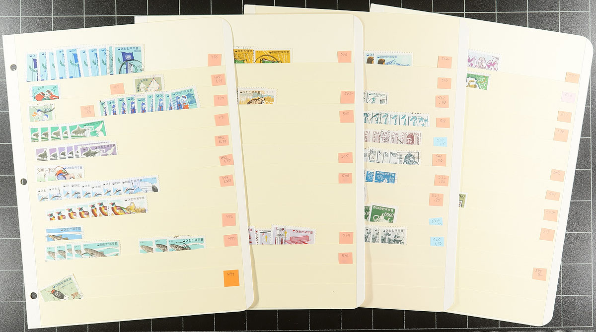 Substantial stock of used, mostly 20th century Korean issues accumulated and organized by a collector, and available for the first time. The early is a bit hit or miss (note #79 x7), and then strong post-WWII to the 1990’s, where it looks more like a collection than a stock. With a good range of semi-postals and airmails (#C30). Up to 20 of a type, catalogue values of individual items to $40.00. All are neatly organized into 50 manila stockpages identified by Scott number and (a slightly older) catalogue values. Condition is better than average and there may also be potential for the cancel collector. Substantial catalogue value here. Estimate =
