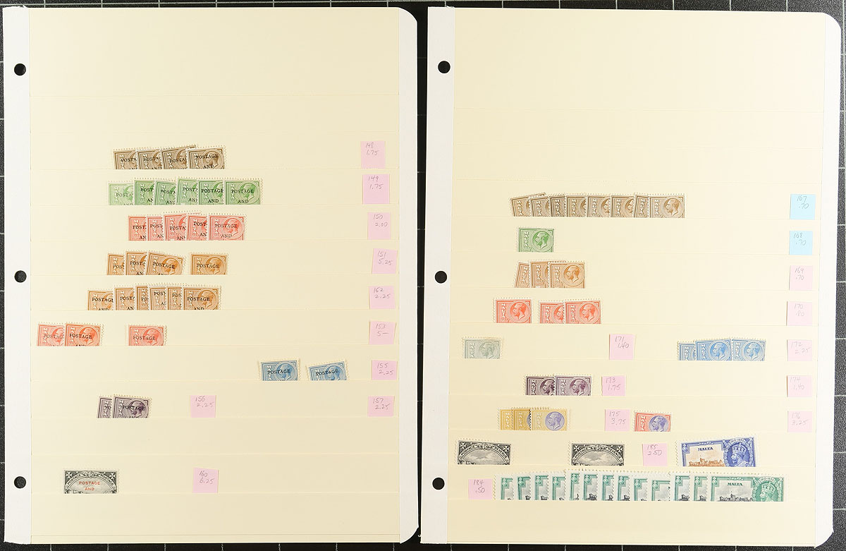 Part A: Mint Malta stock "QV to King George VI". 11 manila stockpages which are strongest in the King George V and VI reigns, noting a number of "Self Government" overprints, with lots of $3-$10 singles and better such as #220-222. Up to 15 of a type, neatly organized with Scott number and catalogue value. Most are hinged, and few faults are to be expected. Estimate =