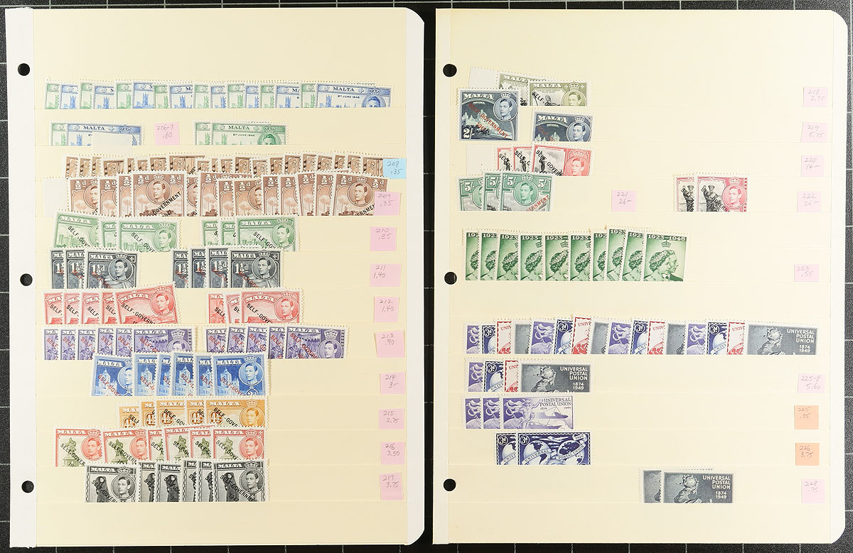 Part A: Mint Malta stock "QV to King George VI". 11 manila stockpages which are strongest in the King George V and VI reigns, noting a number of "Self Government" overprints, with lots of $3-$10 singles and better such as #220-222. Up to 15 of a type, neatly organized with Scott number and catalogue value. Most are hinged, and few faults are to be expected. Estimate =