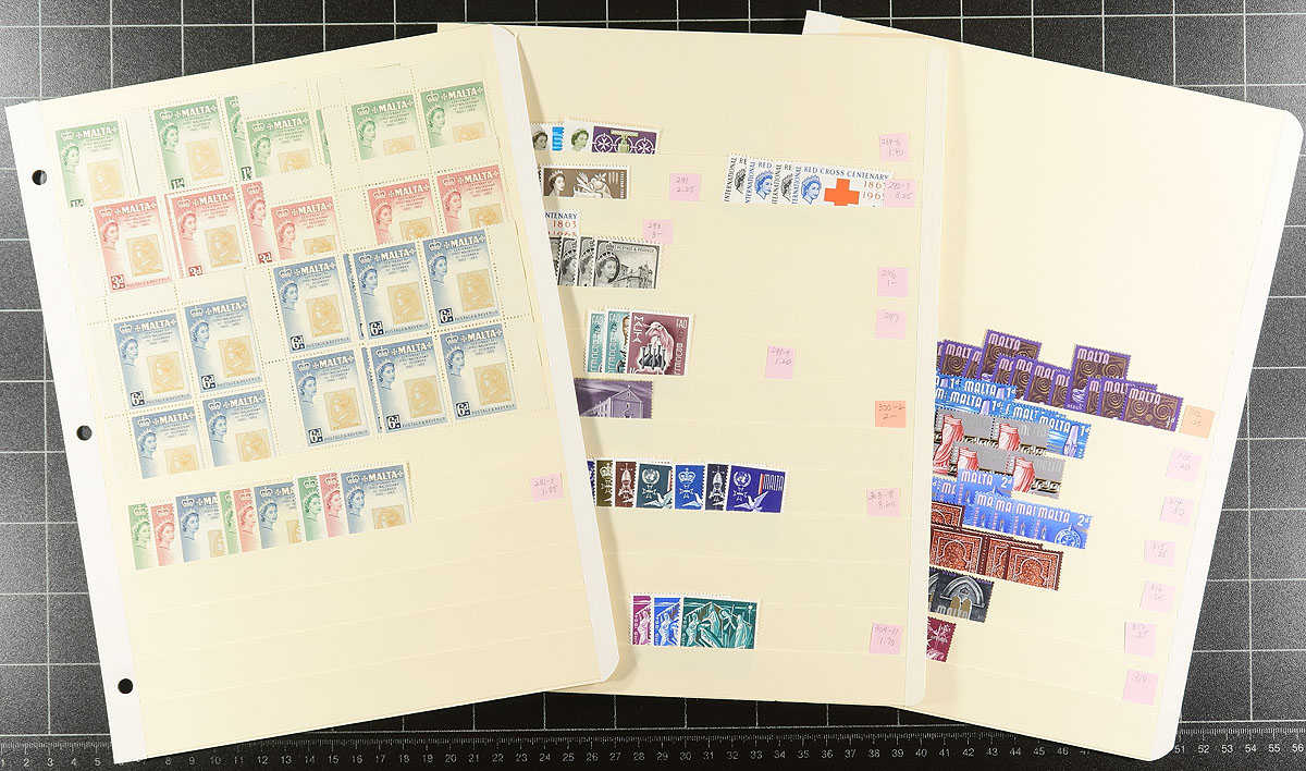 Part B: Mint Malta stock covering the Queen Elizabeth II era to 2000 plus good coverage from the back of the book. The regular issue QEII material includes some better singles (#257-262), plus some multiples, with a couple of later miniature sheets (butterflies and shells). The back of the book is nearly complete (for the period) for semi-postals and war tax issues. The postage dues will make a good start on filling holes, with 7 copies of #J17. Overall expect up to 15 of a type with most being hinged and only a few with visible faults. Neatly laid out on manila stock pages with Scott number. The catalogue value will add up quickly here. Estimate =