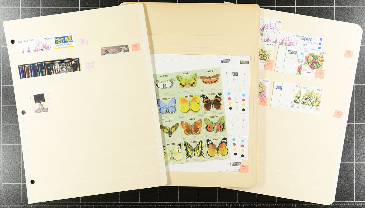 Part B: Mint Malta stock covering the Queen Elizabeth II era to 2000 plus good coverage from the back of the book. The regular issue QEII material includes some better singles (#257-262), plus some multiples, with a couple of later miniature sheets (butterflies and shells). The back of the book is nearly complete (for the period) for semi-postals and war tax issues. The postage dues will make a good start on filling holes, with 7 copies of #J17. Overall expect up to 15 of a type with most being hinged and only a few with visible faults. Neatly laid out on manila stock pages with Scott number. The catalogue value will add up quickly here. Estimate =