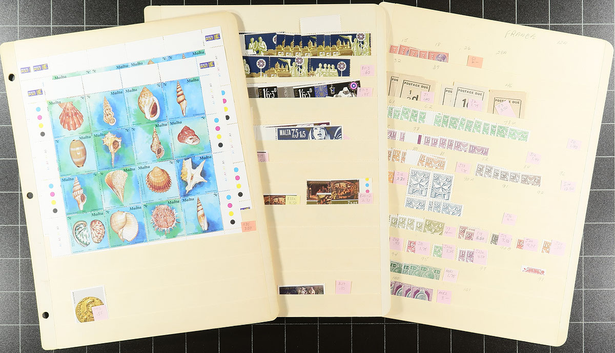 Part B: Mint Malta stock covering the Queen Elizabeth II era to 2000 plus good coverage from the back of the book. The regular issue QEII material includes some better singles (#257-262), plus some multiples, with a couple of later miniature sheets (butterflies and shells). The back of the book is nearly complete (for the period) for semi-postals and war tax issues. The postage dues will make a good start on filling holes, with 7 copies of #J17. Overall expect up to 15 of a type with most being hinged and only a few with visible faults. Neatly laid out on manila stock pages with Scott number. The catalogue value will add up quickly here. Estimate =