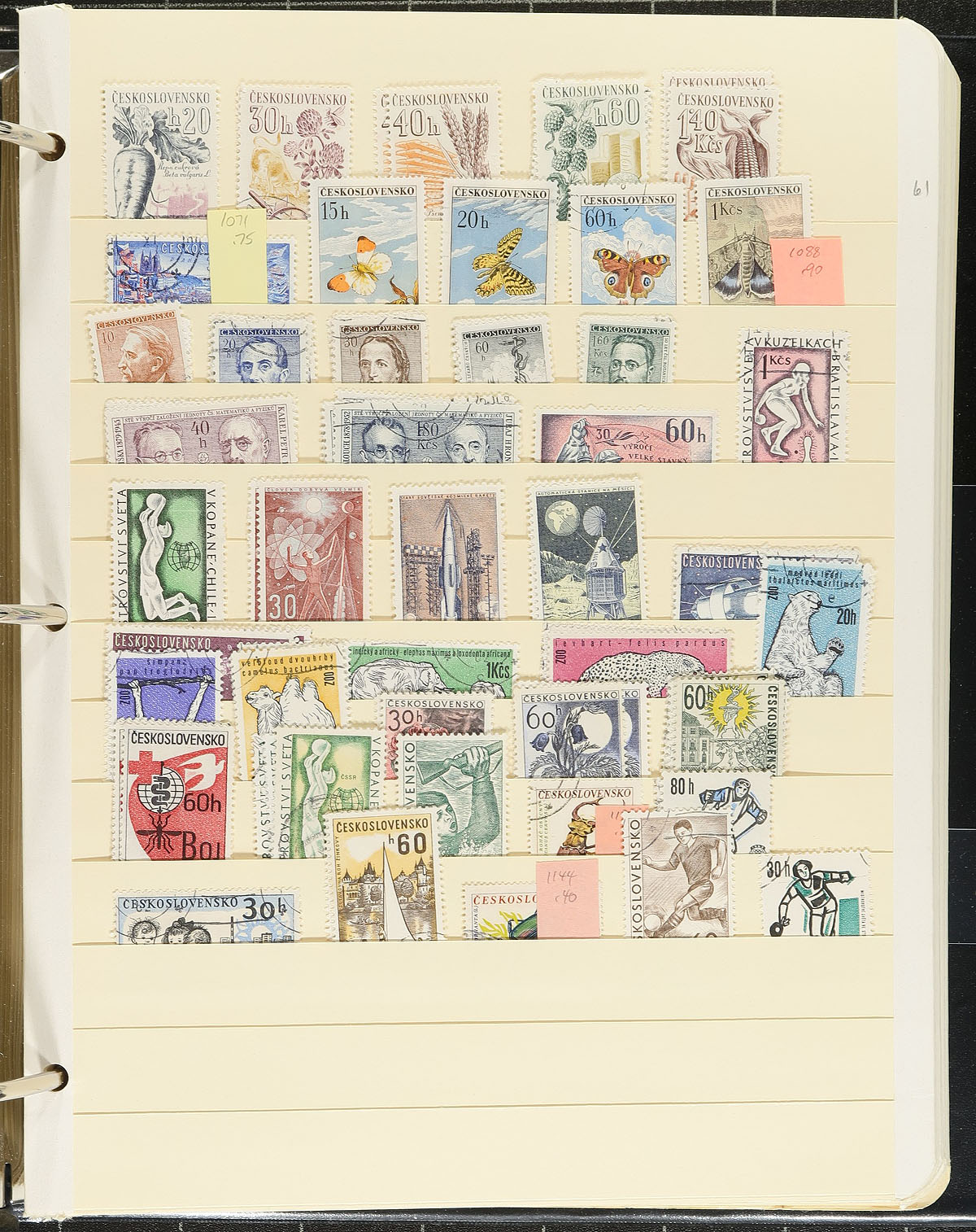 An extensive three binder stock with a wide range of Czech issues. Volume 1 is a used stock (more like a collection in places), chronologically mounted in 39 manila stockpages from the early issues up to the early 2000's, plus a good offering from the "back of the book". Volume 2 is a binder with 42 manila stockpages filled with large blocks (up to folded panes) of mint issues from the 1960's to early 1990's (obviously there is heavy duplication here). The final binder is a stock of mostly used Bohemia and Moravia (again with lots of "back of the book"), from the occupation and war era on manila stockpages. There isn’t much material here with significant individual value, but there is extensive coverage, light to moderate duplication, good condition, well organized and perfect for building on (plus there are over 100 manila stockpages!). Estimate alue =