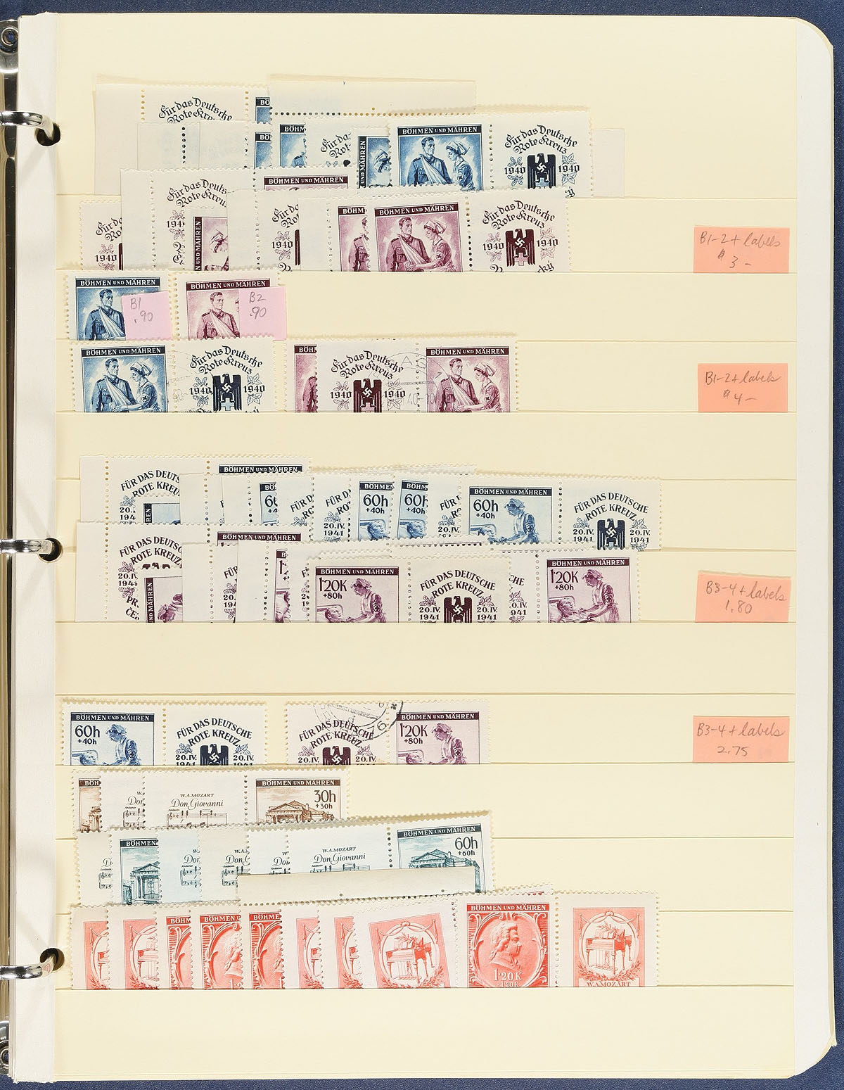 An extensive three binder stock with a wide range of Czech issues. Volume 1 is a used stock (more like a collection in places), chronologically mounted in 39 manila stockpages from the early issues up to the early 2000's, plus a good offering from the "back of the book". Volume 2 is a binder with 42 manila stockpages filled with large blocks (up to folded panes) of mint issues from the 1960's to early 1990's (obviously there is heavy duplication here). The final binder is a stock of mostly used Bohemia and Moravia (again with lots of "back of the book"), from the occupation and war era on manila stockpages. There isn’t much material here with significant individual value, but there is extensive coverage, light to moderate duplication, good condition, well organized and perfect for building on (plus there are over 100 manila stockpages!). Estimate alue =