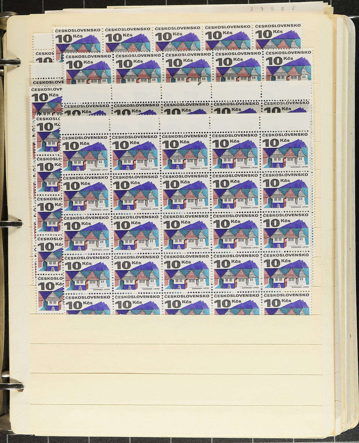 An extensive three binder stock with a wide range of Czech issues. Volume 1 is a used stock (more like a collection in places), chronologically mounted in 39 manila stockpages from the early issues up to the early 2000's, plus a good offering from the "back of the book". Volume 2 is a binder with 42 manila stockpages filled with large blocks (up to folded panes) of mint issues from the 1960's to early 1990's (obviously there is heavy duplication here). The final binder is a stock of mostly used Bohemia and Moravia (again with lots of "back of the book"), from the occupation and war era on manila stockpages. There isn’t much material here with significant individual value, but there is extensive coverage, light to moderate duplication, good condition, well organized and perfect for building on (plus there are over 100 manila stockpages!). Estimate alue =